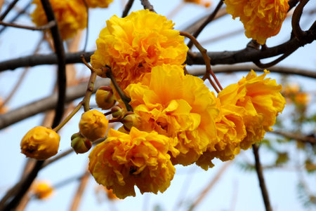 A branch with bright yellow terry flowers and ant tree auraa Tabebuia against a blue sky on a sunny day. Rare botanical orange flowers of Latin America Paraguay Cuba Spring
