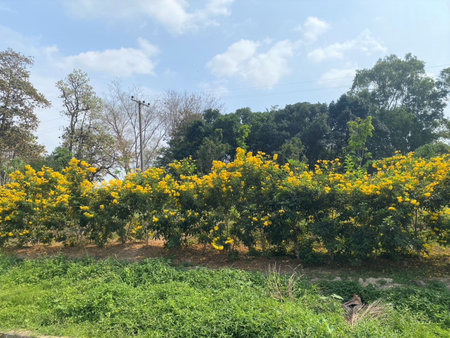 yellow flowers tree on top view sky background , yellow flowers on summer