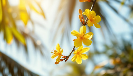 A branch with bright yellow terry flowers and ant tree auraa Tabebuia against a blue sky on a sunny day. Rare botanical orange flowers of Latin America Paraguay Cuba Spring