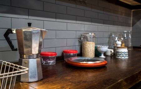 concept organizing kitchen. Attic dining room design and rustic cuisine. Brick wall with shelves with hooks, chopping wooden boards, banks, cups. Kitchen utensils on modern countertop of home cooking.