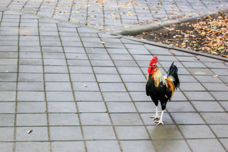 Rooster (also known as a cockerel or cock) in countryside open farm, Beautiful male chicken walking on cement floor.