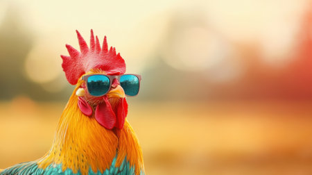 A vibrant and charming rooster wearing cool sunglasses shines against a soft summer background, highlighting its colorful feathers and playful personality.