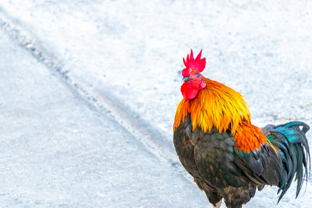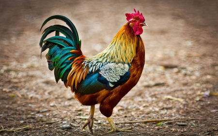 Majestic colorful rooster showcasing vibrant feathers, posed standing.