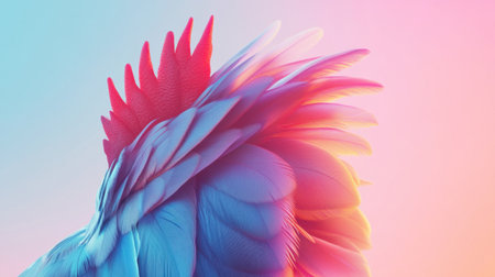This striking image showcases a close-up of a rooster's feathers, bathed in vibrant colors against a soft gradient background, exuding artistic beauty.