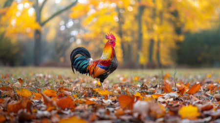 A stunning brown leghorn rooster stands proudly amidst colorful autumn leaves. The vibrant colors and serene setting create a peaceful and natural scene, capturing the essence of rural beauty.