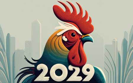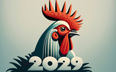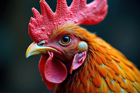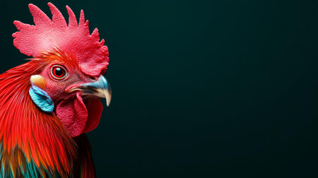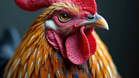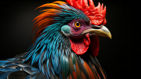Vibrant rooster with bright red comb and detailed feathers against dark background. That the image is generated using AI.