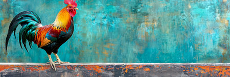 Colorful rooster perched on wooden fence with blank banner for copy space, rural farm animal concept