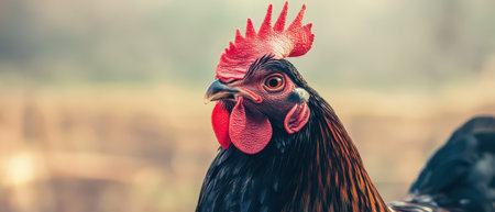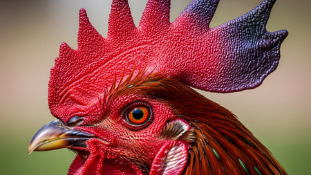 Closeup portrait of a vibrant and colorful rooster with a sharp. Detailed focus on its red comb and textured feathers