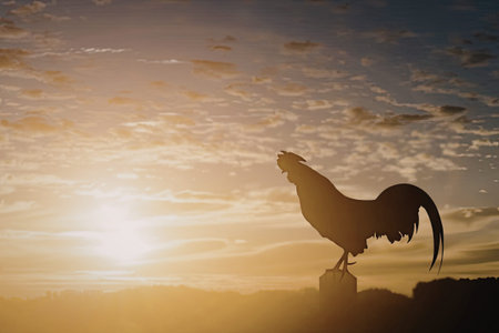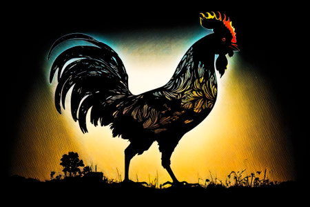 A striking silhouette of a rooster standing on a perch against a vibrant sunrise backdrop, with warm hues of orange and yellow illuminating the sky.