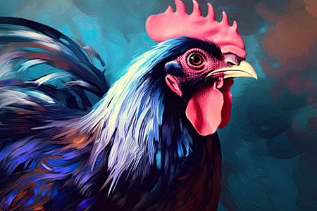 cartoon portrait of a rooster with vibrant paint colors, reminiscent of the artistic styles of tyler shields and filip hodas. the monochromatic compositions and bright color blocks create a visually striking image. the rooster's features are captured with precision, showcasing tonal variations in color. this artwork combines elements of wildlife photography and li wei's unique artistic approach. ai generated