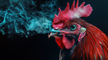 A stunning close-up of a vibrant rooster adorned with colorful smoke, creating a dramatic and artistic effect perfect for wildlife and farm themes.