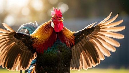 A majestic rooster flaps its wings and crows against a vibrant sunrise background. The golden light backlights the bird, highlighting its feathers in a peaceful farm setting.