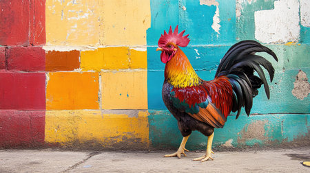 A striking rooster standing in front of a vividly painted mural wall, blending natural and urban artistry