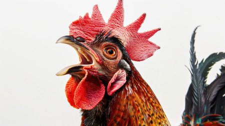 Majestic rooster with a vibrant plumage and expressive eyes against a plain white background