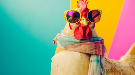 chicken sunglasses and scarf in studio with a colorful and bright background