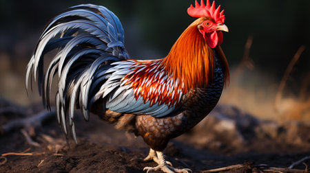 Vibrant rooster with bright red comb and detailed feathers against dark background. That the image is generated using AI.