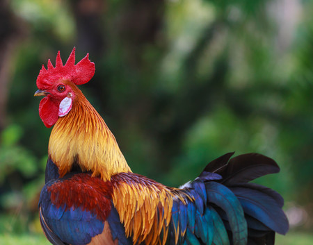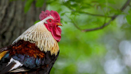 Colorful rooster in the garden, close-up portrait.