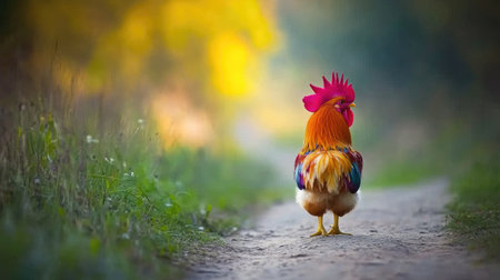 A vibrant rooster struts along a peaceful country pathway, showcasing its colorful plumage. The warm sunlight casts a serene glow, creating a picturesque rural scene.