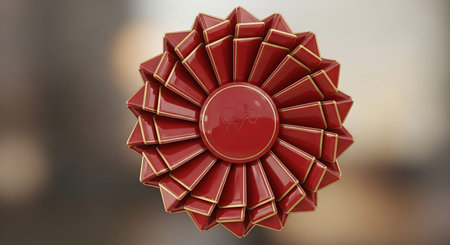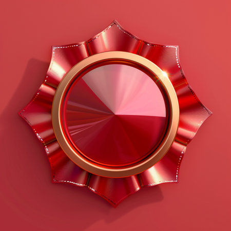 Stock showing red rosette badge with gold trim and central emblem on blurred background. resolution use.
