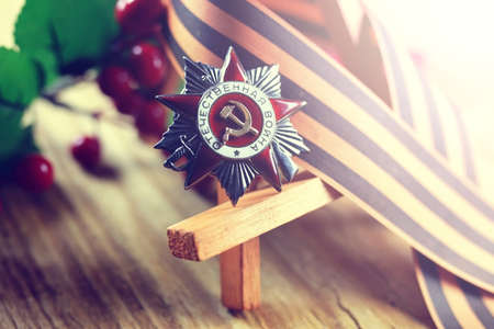 The Soviet order of the Second World war and George ribbon Victory Day 9 May postcard concept, toned vintage