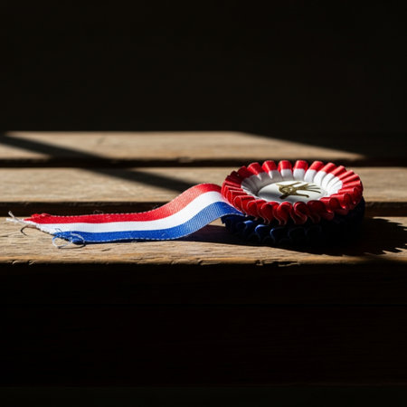 High-contrast side profile silhouette of a worn red, white, and blue rosette ribbon on a dusty woode