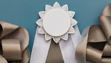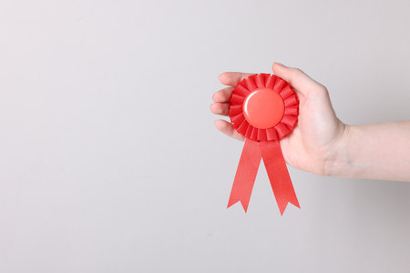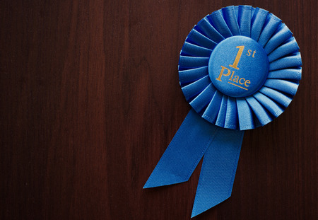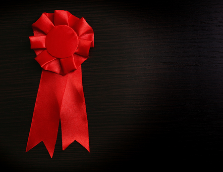 A vibrant red ribbon award displayed against a soft blue background, representing achievement and recognition for various accomplishments and events.