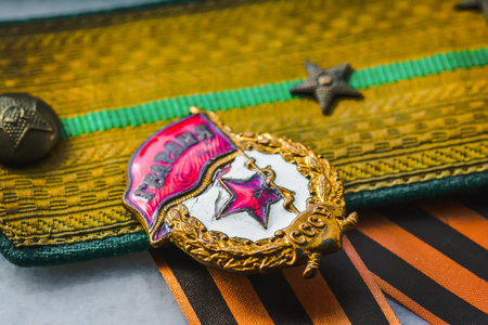 St. George's ribbon and the Order of the Red Star of the USSR World War II veteran on a wooden background. Translation into Russian: Workers of all countries unite. The concept of the May 9 holiday.