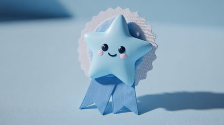 A vibrant red ribbon award emblem set against a soft blue background, symbolizing achievement and recognition for exceptional accomplishments. Perfect for celebration themes and award presentations.