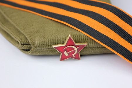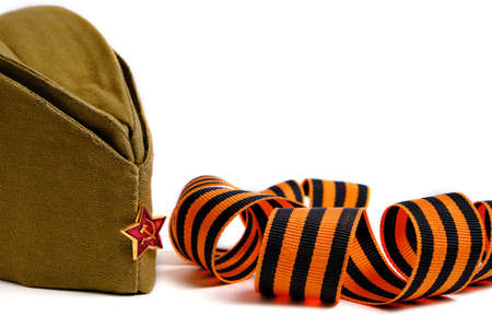 Cap with red star and George ribbon, headdress serviceman Red Army Soviet Union, on white background