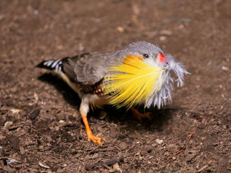 Finch on the ground, collecting feathers for the nest