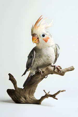 Closeup portrait of a curious and inquisitive cockatiel bird tilting its head to the side,perched on a branch against a clean white background.