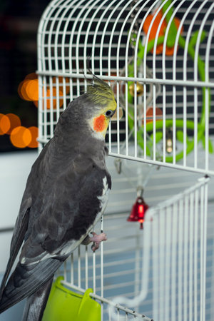 Beautiful yellow Cockatiel parrot sitting in metal cage