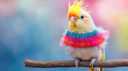 A charming cockatiel with vibrant plumage and a knitted sweater poses on a branch. The soft bokeh background enhances the cheerful ambiance, perfect for animal lovers.