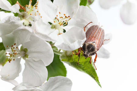 Branch of a blooming apple tree with a cockchafer in a spring orchard.