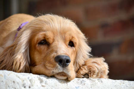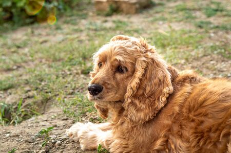 Portrait of an American Cocker Spaniel dog resting in the garden on a sunny day.
