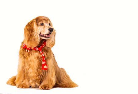 Close-up muzzle of beautiful Cocker Spaniel dog devotedly looking and begging for food isolated over white background.