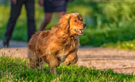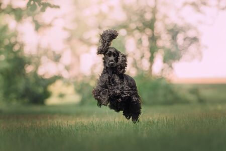American Cocker Spaniel young in the green grass, evening sun. green background.