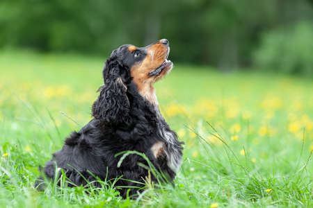 Young english cocker spaniel dog sitting in green grass at summer nature
