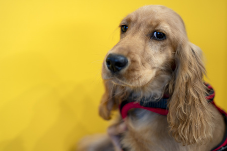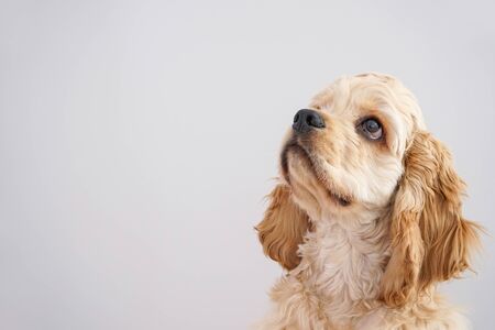 Dog. American Cocker Spaniel puppy on a gray background, close-up. Space for text.
