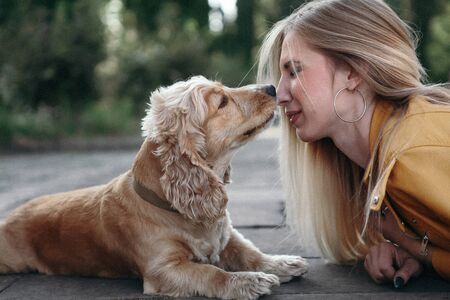 The dog is lying down and looking straight into the camera. Panoramic frame. English cocker spaniel with honey gold coat. View from the side.
