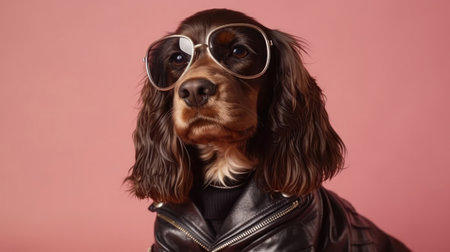 Cocker Spaniel Dog Wearing A Leather Jacket And Sunglasses On Pink Background