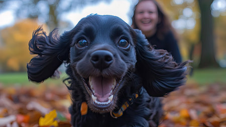 A joyful Cocker Spaniel running ahead of its owner in a park covered in autumn leaves, the woman smiling in the background.