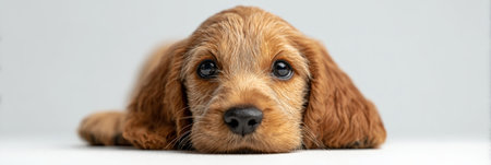 Red cocker spaniel puppy lying on a white background, looking directly into the camera with big, dark eyes, creating an endearing and innocent expression
