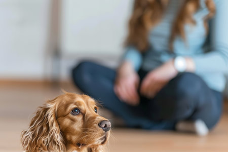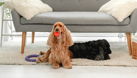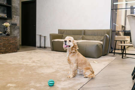 Young american cocker spaniel dog sitting on a floor in the living room at home.
