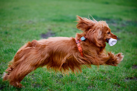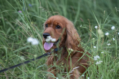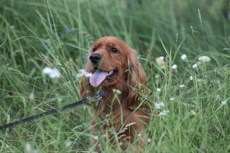 Happy red spaniel dog runs in tall green grass on a sunny day. Relaxed pet with a ball in the park enjoying springtime outdoors