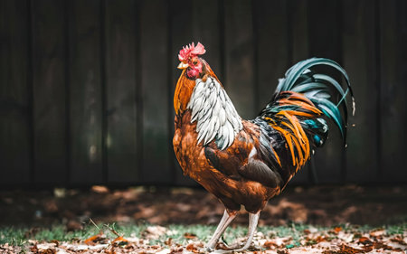 A rooster strutting confidently in a rural farm setting, embodying the spirit of strength and vitality.