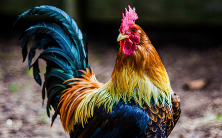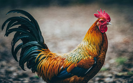 Close-up of vibrant rooster with colorful feathers in natural setting. That the image is generated using AI.