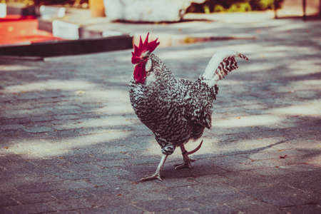 Rooster (also known as a cockerel or cock) in countryside open farm, Beautiful male chicken walking on cement floor.