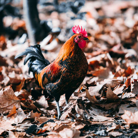 Beautiful rooster standing on the ground in the garden. Colorful rooster.