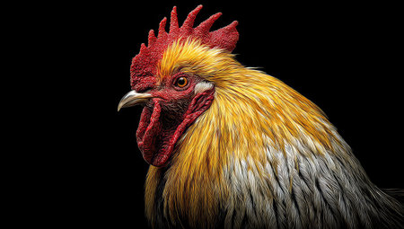 A striking close-up showcases a rooster with colorful plumage. The bird's head displays a vibrant mix of red and yellow hues, highlighted against a deep black background. The image highlights the textures of the feathers and the rooster's detailed features, suitable for various illustrative and commercial applications.
